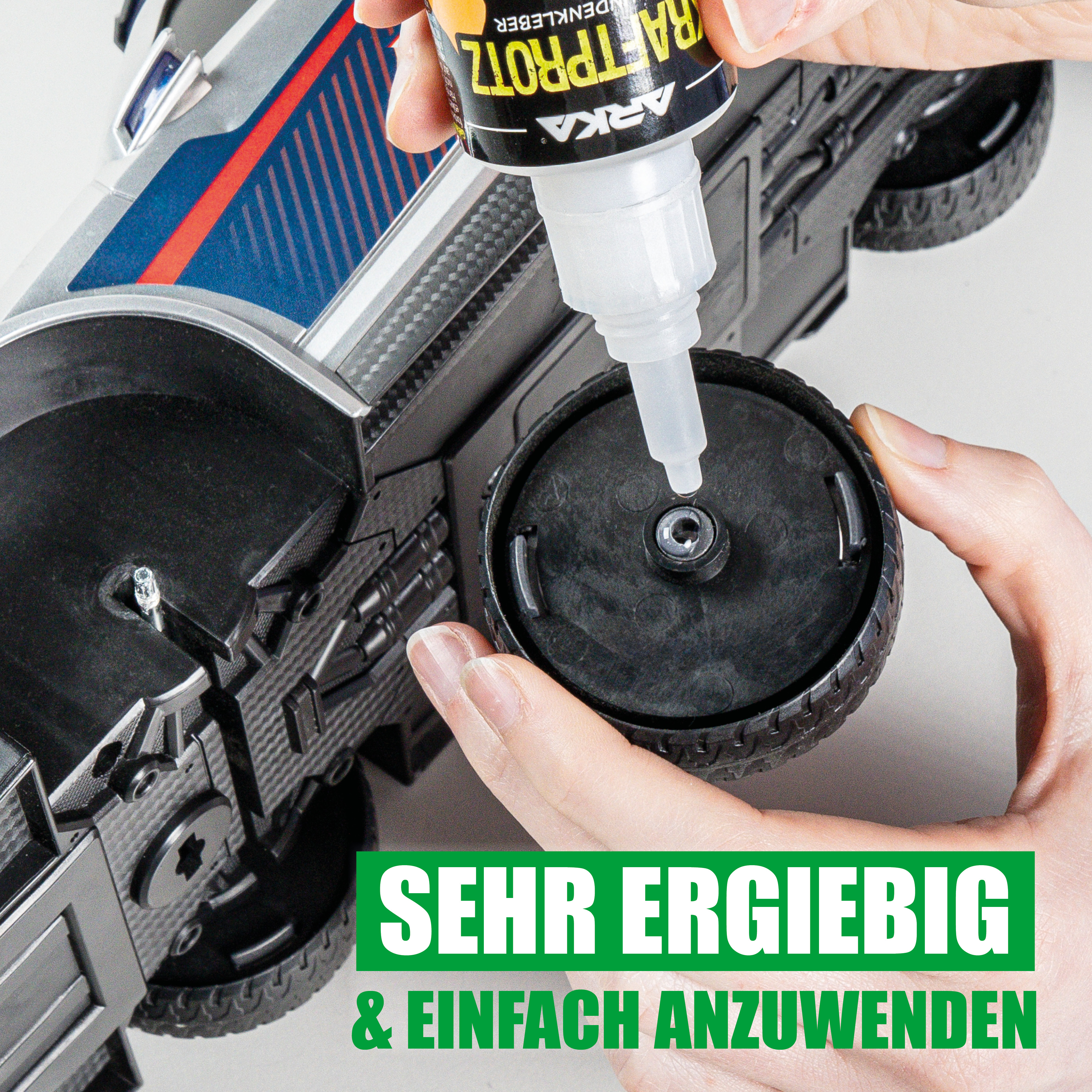 Kraftprotz Automotive Sekundenkleber 50 gARKA KRAFTPROTZ AUTOMOTIVE | Der Kraftprotz ist eine echte Allzweckwaffe für alle Klebeprozesse, die schnelle und kraftvolle Verbindungen erfordern. Seine breite Materialkompatibilität, Leistungsstärke, einfache Anwendung machen ihn zur idealen Wahl.SCHNELL & EFFEKTIV: Der Superkleber ist schnell trocknend, hitzebeständig, witterungsbeständig, wasserfest und haftet auf vielen verschiedenen Oberflächen. Dank seiner einzigartigen Eigenschaften kann man sehr schnell kraftvolle Verbindungen herstellen.UNIVERSELL: Der Alleskleber eignet sich ideal zum Verkleben von Metallen, Kunststoff, Plastik, Holz, Glas, Stoffen, Leder, Gummi uvm. Der perfekte Partner für jeden Haushalt, jede Werkstatt, Baustellen und Bastelbedarf.BENUTZERFREUNDLICH: Da der Kleber einkomponentig ist, ist für den Auftrag kein Mischen notwendig. Nach dem Auftragen härtet der Kleber schnell bei Raumtemperatur aus. Dank des speziellen Deckels wird ein Verkleben der Dosierspitze verhindert.Geeignet für:Kunststoff (ohne PE & PP) - Metall - Aluminium - Gummi - Leder - Holz - Porzellan - Stein - Glas - u.v.m.Erhätliche Viskositäten:Gel - Flüssig - DünnflüssigDosierung:Kraftprotz auf die zu verklebenden Stellen auftragen und für ein paar Sekunden fixieren.SicherheitsdatenblattHerstellerangaben:ARKA Biotechnologie GmbHMühllach 53-55D-90552 RöthenbachFax: +49 (0)911 5698610 29 Tel.:+49 (0)911 5698610 00 emaill: info@arka-biotech.de
