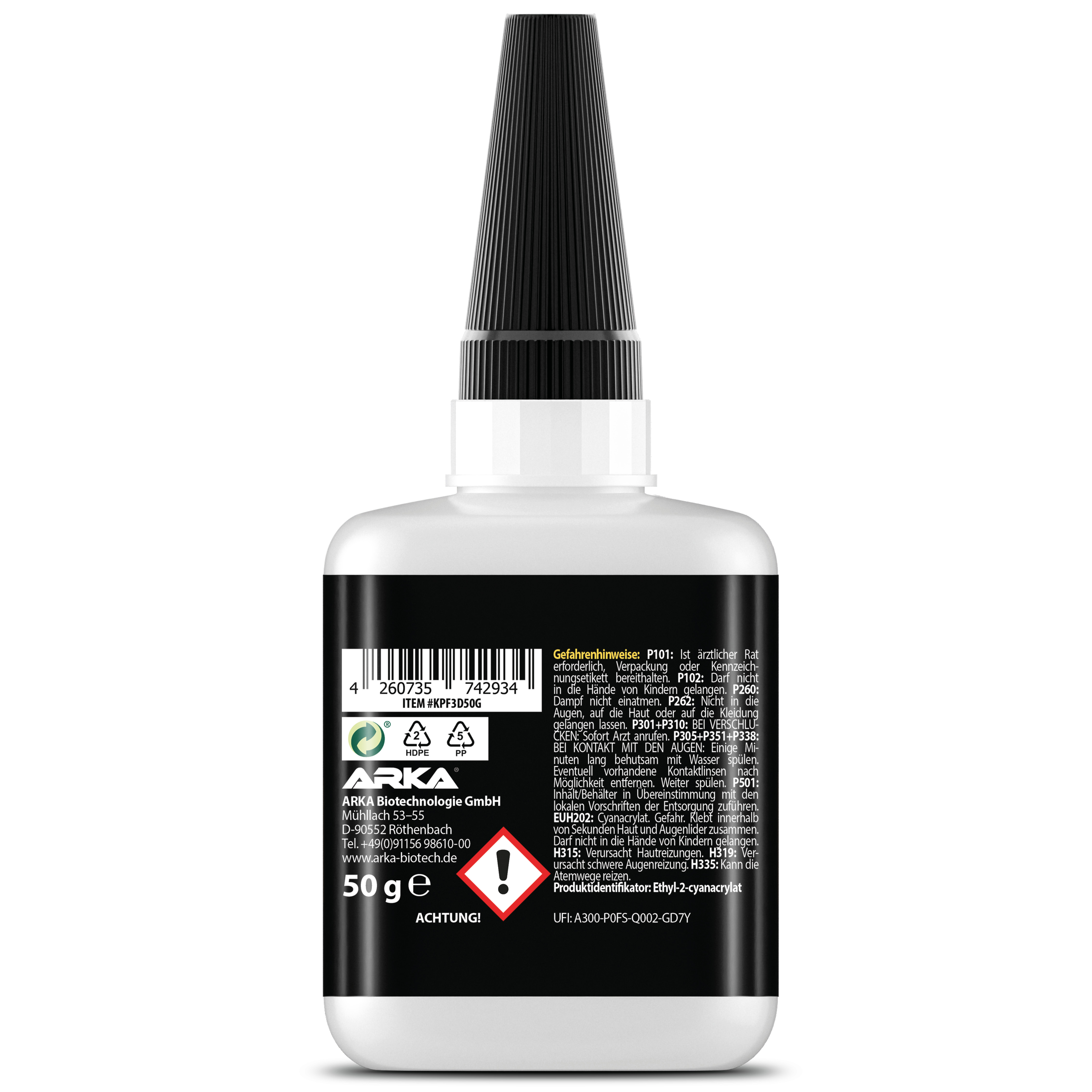Kraftprotz Kunststoff Sekundenkleber 50 gARKA KRAFTPROTZ KUNSTSTOFF | Der Kraftprotz ist ein echtes Allround-Talent für alle Klebeprozesse, welche schnelle und kraftvolle Verbindungen erfordern. Seine breite Materialkompatibilität mit den unterschiedlichsten Arten von Plastik und Kunstoffen, seine Leistungsstärke sowie eine einfache Anwendung machen ihn zur idealen Wahl.SCHNELL & EFFEKTIV: Der Superkleber ist schnell trocknend, hitzebeständig, witterungsbeständig, wasserfest und haftet auf vielen verschiedensten Kunststoffen und Plastik. Dank seiner einzigartigen Eigenschaften kann man sehr schnell kraftvolle Verbindungen herstellen.UNIVERSELL & TRANSPARENT: Der Alleskleber ist der perfekte Partner für jeden Haushalt, jede Werkstatt, Baustellen und Bastelbedarf. Dank seiner transparenten Farbe entstehen saubere und dezente Klebestellen.BENUTZERFREUNDLICH: Da der Kleber einkomponentig ist, ist für den Auftrag kein Mischen notwendig. Nach dem Auftragen härtet der Kleber schnell bei Raumtemperatur aus. Dank des speziellen Deckels wird ein Verkleben der Dosierspitze verhindert.Erhätliche Viskositäten:Gel - Flüssig - DünnflüssigDosierung:Kraftprotz auf die zu verklebenden Stellen auftragen und für ein paar Sekunden fixieren.SicherheitsdatenblattHerstellerangaben:ARKA Biotechnologie GmbHMühllach 53-55D-90552 RöthenbachFax: +49 (0)911 5698610 29 Tel.:+49 (0)911 5698610 00 emaill: info@arka-biotech.de