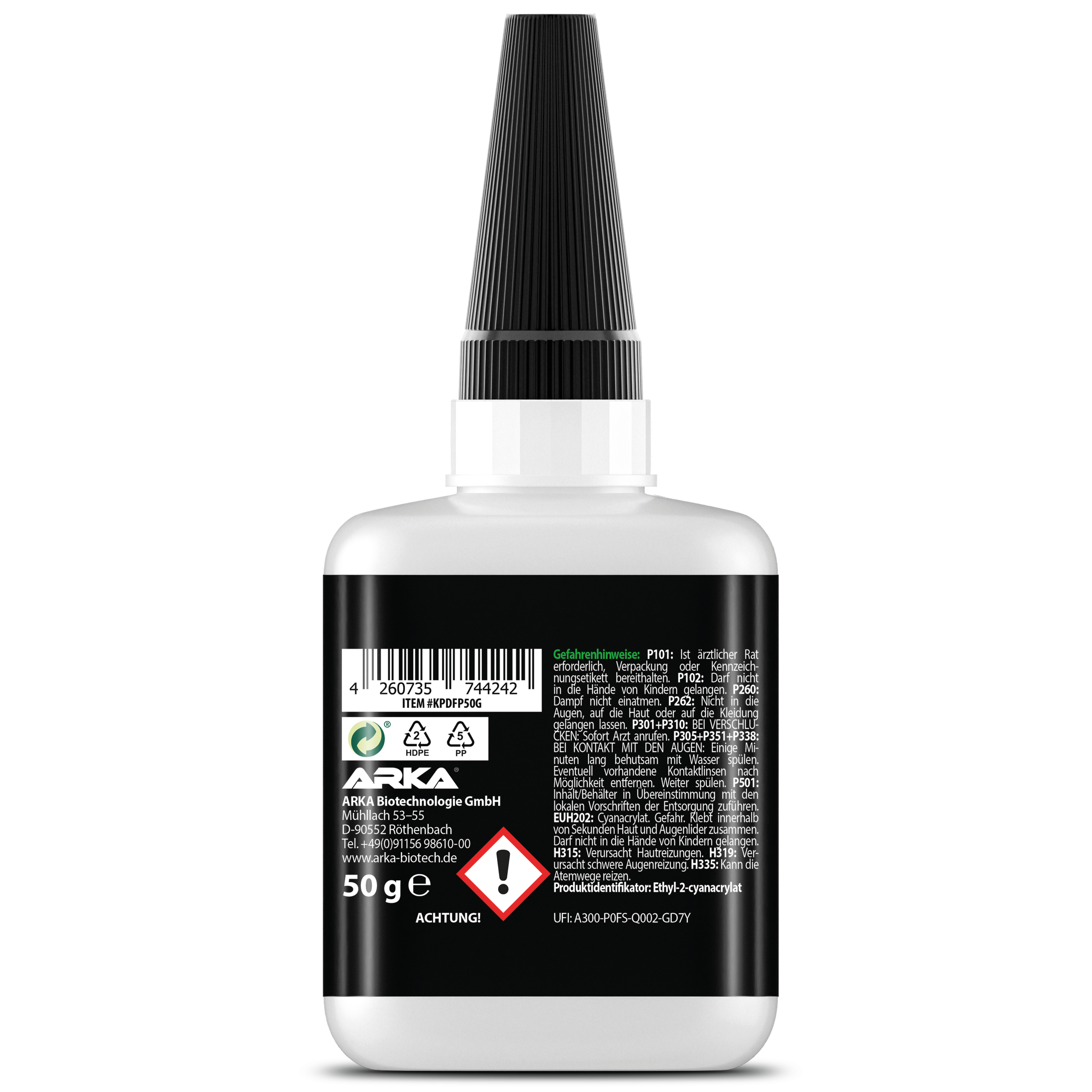 Kraftprotz 3D-Druck Sekundenkleber 50 gARKA KRAFTPROTZ 3D-DRUCK | Der Kraftprotz ist ein echtes Allround-Talent für alle Klebeprozesse im Bereich 3D-Druck, welche schnelle und kraftvolle Verbindungen erfordern. Seine breite Materialkompatibilität, Leistungsstärke und einfache Anwendung machen ihn zur idealen Wahl und zu einem sinnvollen 3D Drucker Zubehör.SCHNELL & EFFEKTIV: Der Superkleber ist schnell trocknend, hitzebeständig, witterungsbeständig, wasserfest und haftet auf vielen verschiedenen Oberflächen. Dank seiner einzigartigen Eigenschaften kann man sehr schnell kraftvolle Verbindungen herstellen.UNIVERSELL: Der Alleskleber eignet sich ideal zum Verkleben von PLA, ABS, PETG, TPU und vielen weiteren Materialien rund um das Anwendungsgebiet 3D-Druck.SPEZIELLE SPITZE GEGEN AUSTROCKNUNG: Dank der verbauten Kunststoffspitze im Inneren des Deckels, wird ein Austrocknen oder Verkleben der Dosierspitze verhindert und der Kleber kann über einen längeren Zeitraum genutzt werden.Geeignet für:PLA - ABS - PETG - TPU - u.v.m.Erhätliche Viskositäten:Gel - Flüssig - DünnflüssigDosierung:Kraftprotz auf die zu verklebenden Stellen auftragen und für ein paar Sekunden fixieren.SicherheitsdatenblattHerstellerangaben:ARKA Biotechnologie GmbHMühllach 53-55D-90552 RöthenbachFax: +49 (0)911 5698610 29 Tel.:+49 (0)911 5698610 00 emaill: info@arka-biotech.de