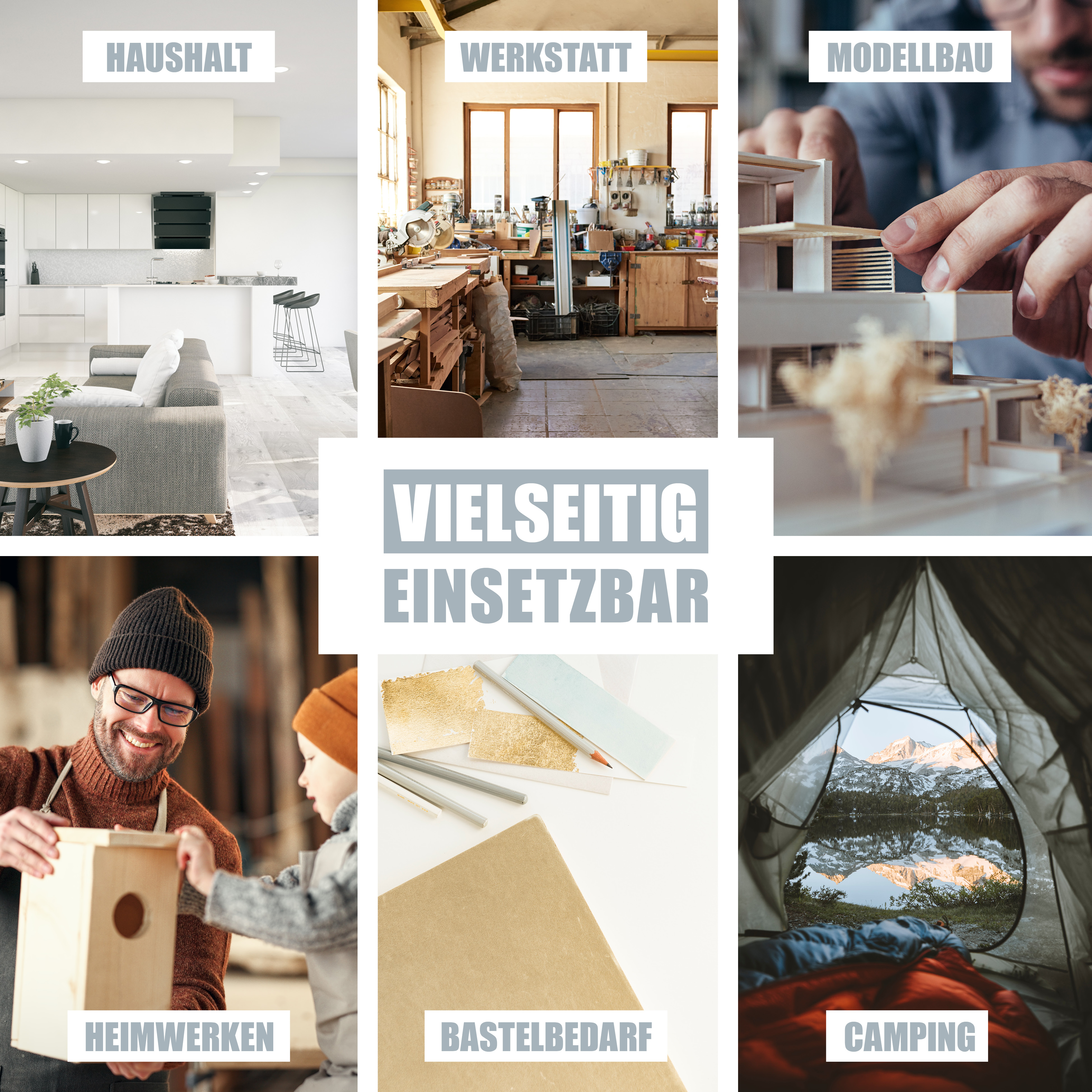 UNIVERSELL & TRANSPARENT: Der Alleskleber ist der perfekte Partner für jeden Haushalt, jede Werkstatt, Baustellen und Bastelbedarf. Dank seiner transparenten Farbe entstehen saubere und dezente Klebestellen.