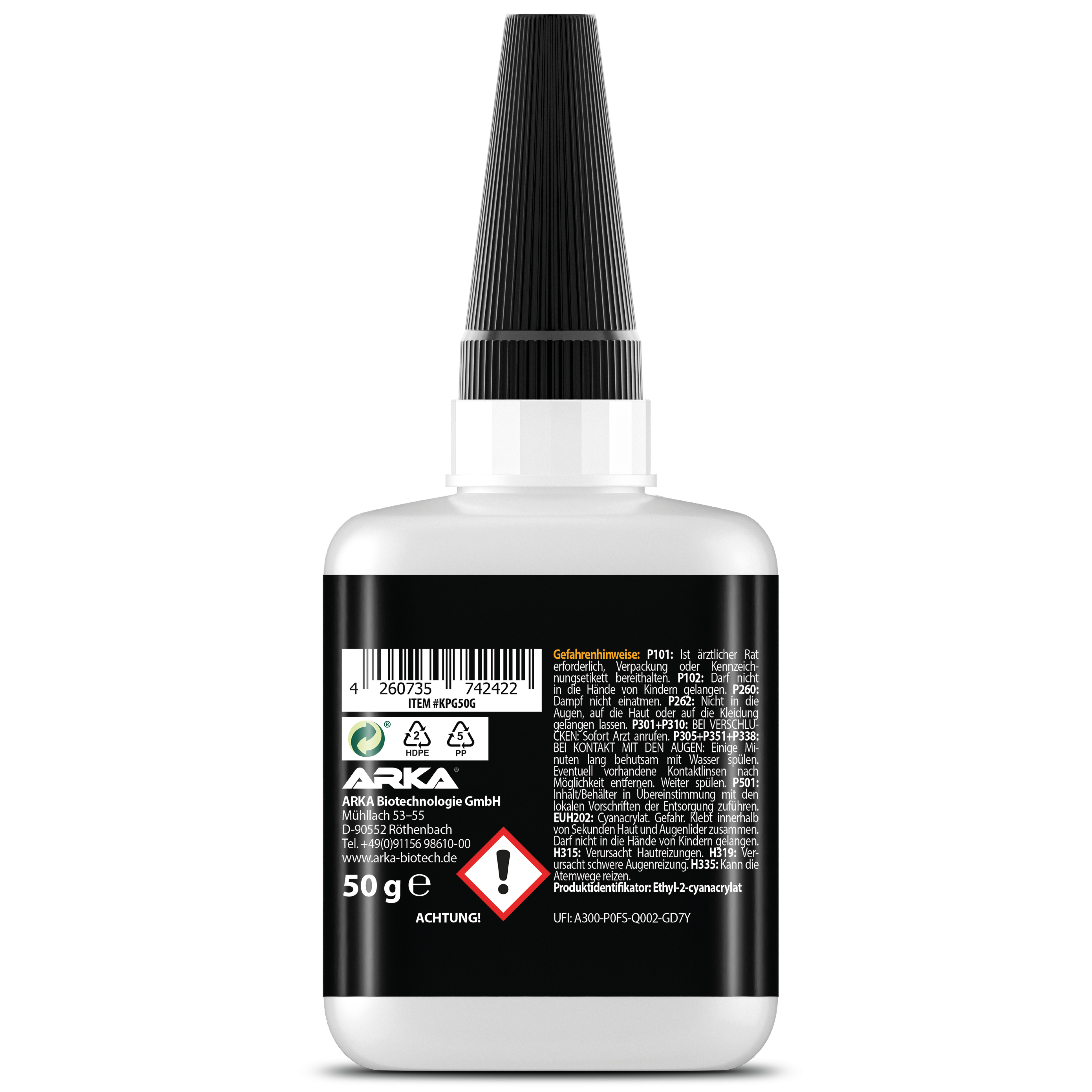 Kraftprotz Kunststoff Sekundenkleber 50 gARKA KRAFTPROTZ KUNSTSTOFF | Der Kraftprotz ist ein echtes Allround-Talent für alle Klebeprozesse, welche schnelle und kraftvolle Verbindungen erfordern. Seine breite Materialkompatibilität mit den unterschiedlichsten Arten von Plastik und Kunstoffen, seine Leistungsstärke sowie eine einfache Anwendung machen ihn zur idealen Wahl.SCHNELL & EFFEKTIV: Der Superkleber ist schnell trocknend, hitzebeständig, witterungsbeständig, wasserfest und haftet auf vielen verschiedensten Kunststoffen und Plastik. Dank seiner einzigartigen Eigenschaften kann man sehr schnell kraftvolle Verbindungen herstellen.UNIVERSELL & TRANSPARENT: Der Alleskleber ist der perfekte Partner für jeden Haushalt, jede Werkstatt, Baustellen und Bastelbedarf. Dank seiner transparenten Farbe entstehen saubere und dezente Klebestellen.BENUTZERFREUNDLICH: Da der Kleber einkomponentig ist, ist für den Auftrag kein Mischen notwendig. Nach dem Auftragen härtet der Kleber schnell bei Raumtemperatur aus. Dank des speziellen Deckels wird ein Verkleben der Dosierspitze verhindert.Erhätliche Viskositäten:Gel - Flüssig - DünnflüssigDosierung:Kraftprotz auf die zu verklebenden Stellen auftragen und für ein paar Sekunden fixieren.SicherheitsdatenblattHerstellerangaben:ARKA Biotechnologie GmbHMühllach 53-55D-90552 RöthenbachFax: +49 (0)911 5698610 29 Tel.:+49 (0)911 5698610 00 emaill: info@arka-biotech.de